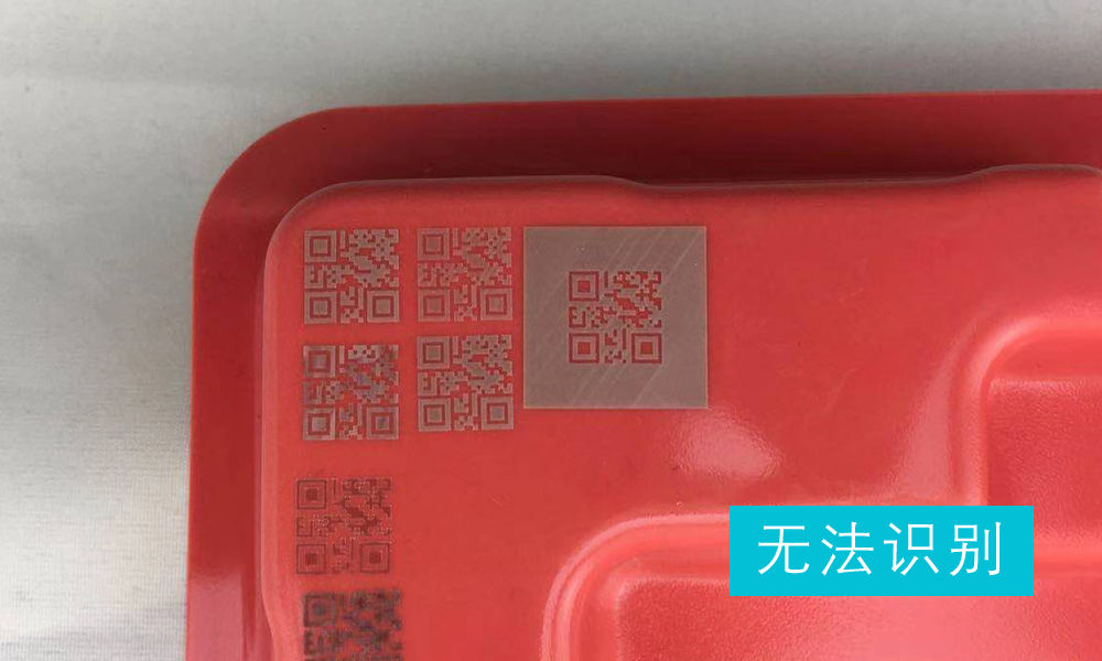 由于吸塑盒為紅色,客戶定義的掃碼槍為霍尼韋爾1900S型號,掃描槍的光源也為紅色,直接雕刻出白色的二維碼也無法識別。解決辦法:先將二維碼打出深度底色,再打出白色的二維碼,即可輕松識別。